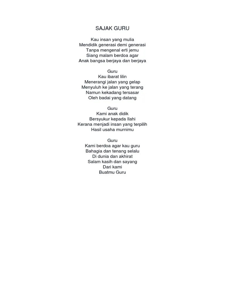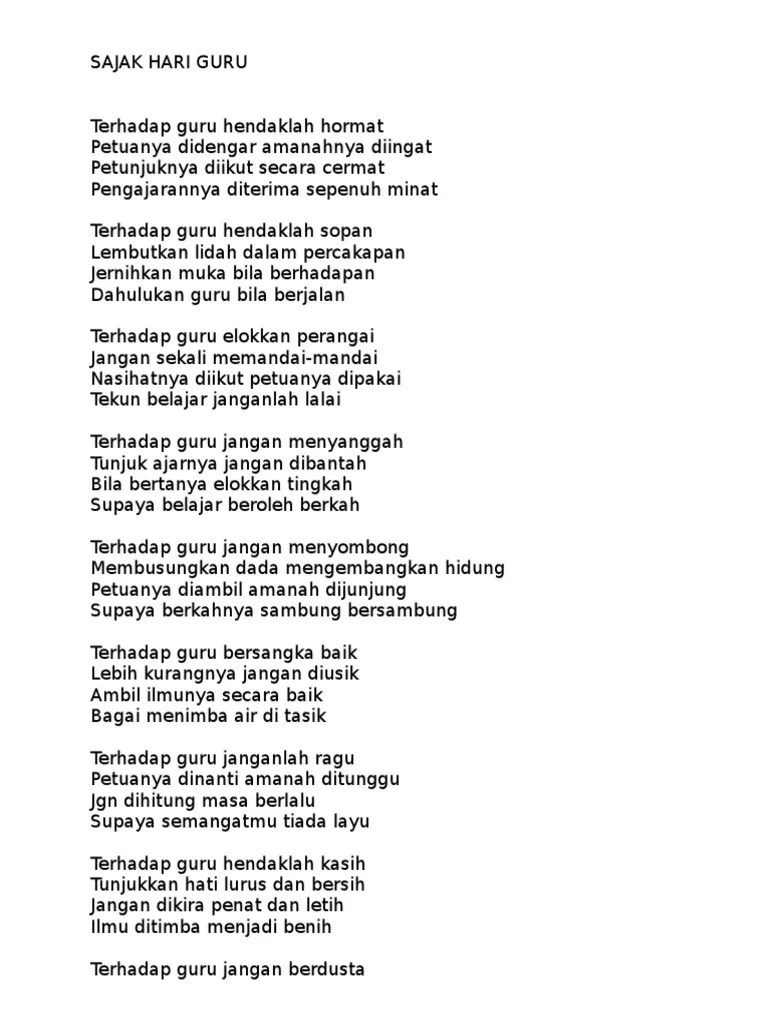 Guru adalah lampu penyuluh pedoman … Gerbang sekolah ada ragu akan ke mana membawa langkah, memetik harapan atau pergi tanpa tujuan tapi sapa guru melecut. 15.02.2010 · sajak buat guru sajak ini ku tujukan kepada seorang yang bergelar cikgu dan guru. Ibarat bunga kembang tak jadi. Pengorbananmu tak termampu dibalas, hanya mampu dikenang. Aziz guru adalah ibu pengasuh budiman guru adalah ratu lebah lalu memujuk membelai kelopak cinta kasih sayang lilinnya berbunga sinar cahaya madunya berbunga penawar jiwa.